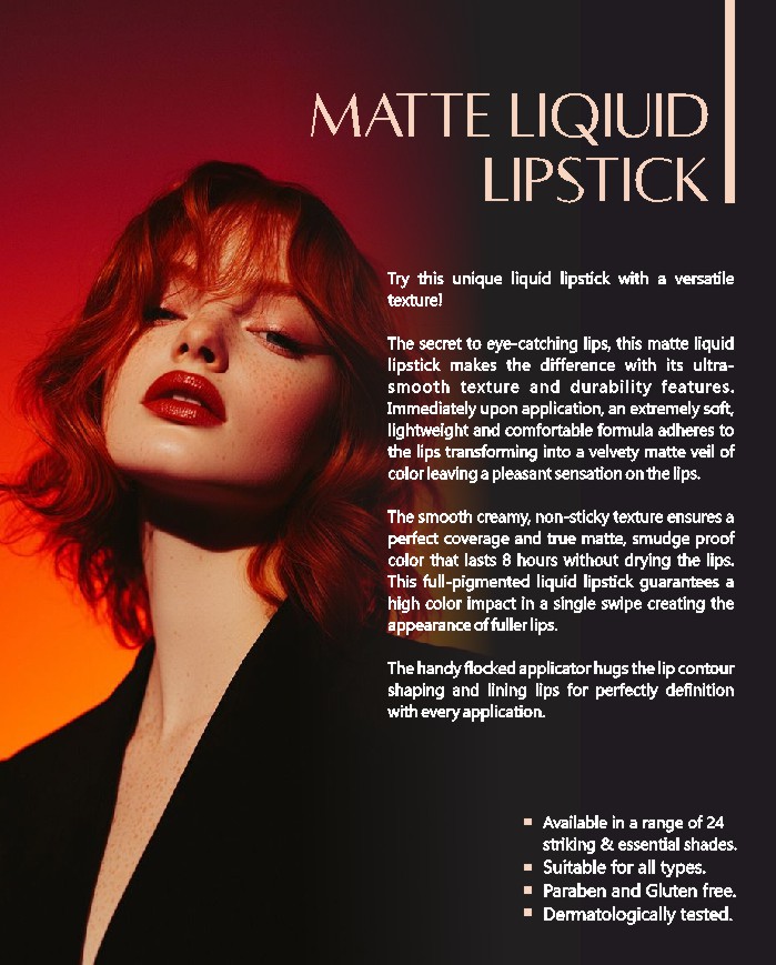 Designed for long wear, the formula is lightweight yet highly pigmented, delivering rich color payoff in just one swipe. It stays comfortable on the lips for up to 8 hours, without smudging, flaking, or drying—so your lips look fresh and flawless all day.